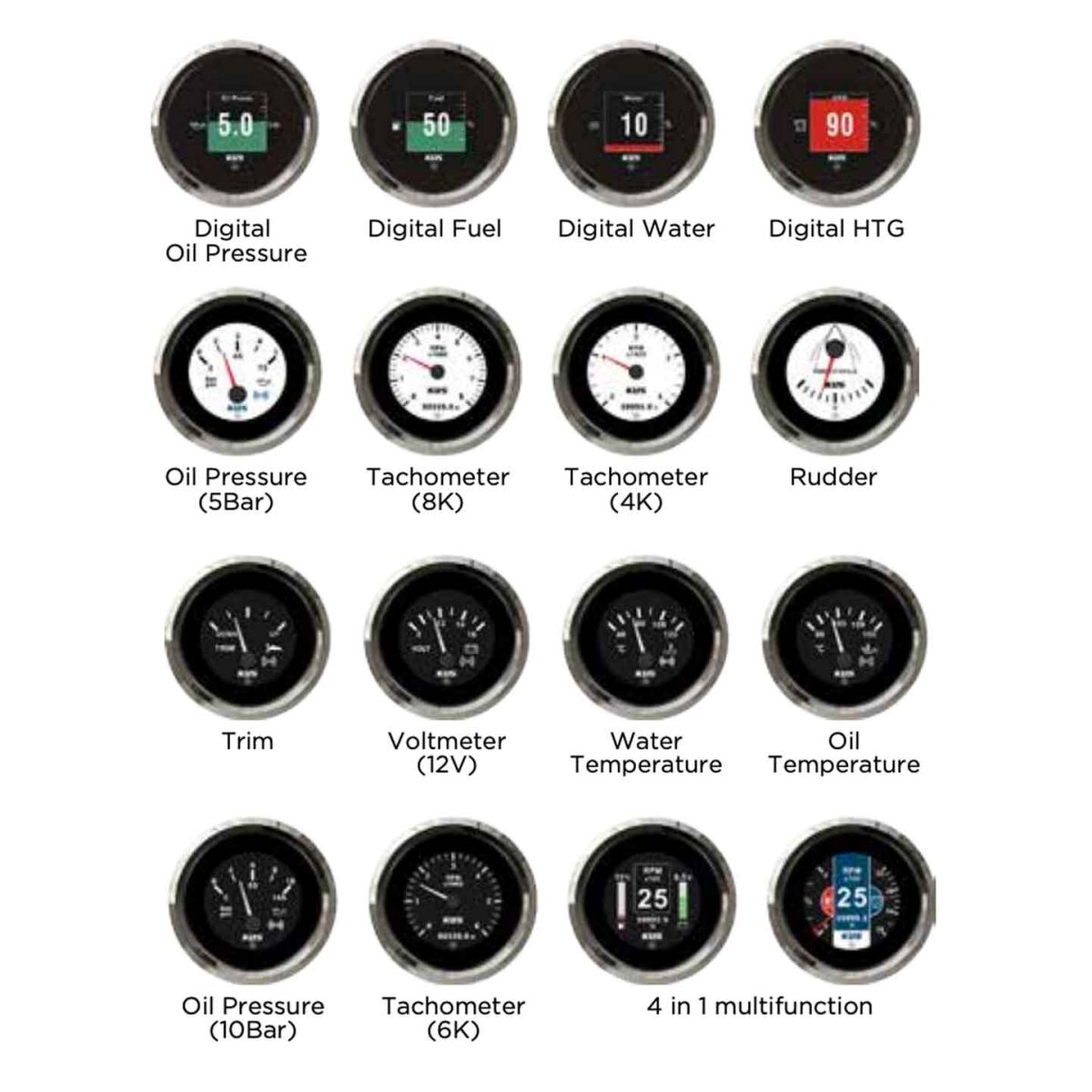 - Funciones de alarma: voltímetro (10 V), combustible (10 %), nivel de agua (10 %), temperatura del agua (95 °C/203 °F), temperatura del aceite (100 °C/212 °F), presión del aceite (1,0 bar), depósito de aguas residuales (80 %), personalizable.