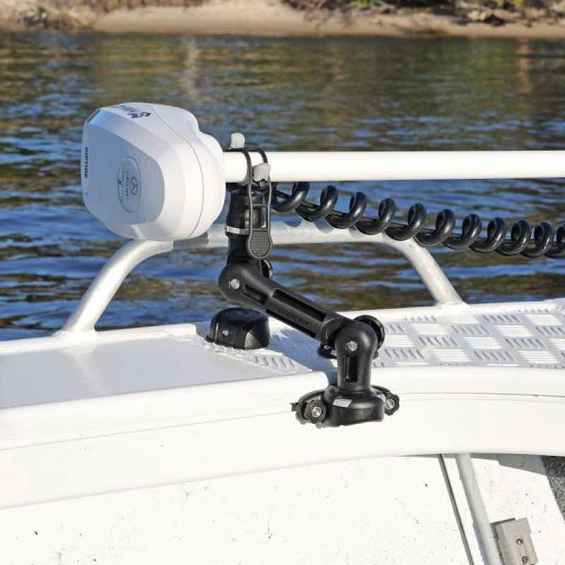 Soporte seguro para su motor eléctrico durante la navegación, ya sea en el agua o en el remolque. Este soporte se puede desplazar hacia dentro y hacia fuera, dependiendo de cómo esté montado su motor eléctrico. Además, el soporte es regulable en altura y, por lo tanto, compatible con diferentes alturas de eje.